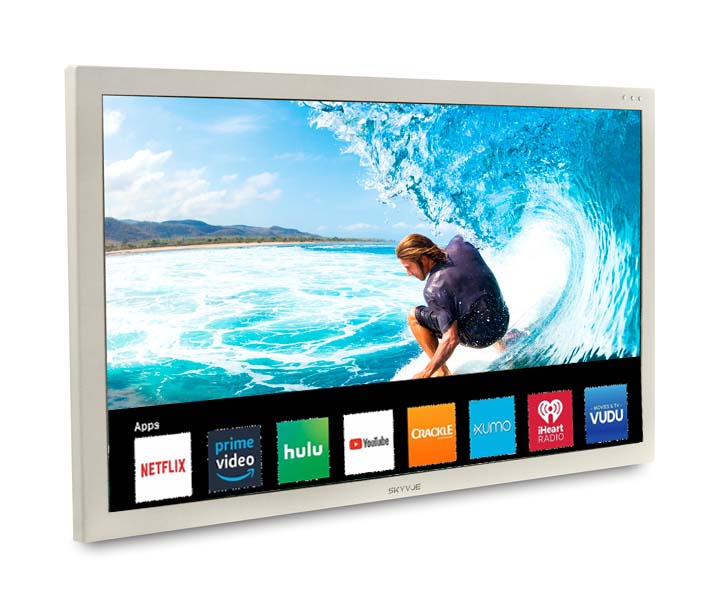 SkyVue's new Outdoor Fusion Series brings the best smart technology to the outdoors. An innovative and high-quality product at an affordable price. This new TV boasts a 4K HDR 600 nit bright LED video panel, perfect for shaded outdoor environments. SkyVue's weather-proof chassis is built with a powder coated rust-free aluminum body for extreme durability. The SkyVue Fusion contains thousands of apps for different entertainment desires. Built with 20W internal speakers, customers can also choose from an optional 40W or 150W Sound Bar. All SkyVue Fusion TVs are manufactured and assembled in-house at SkyVue's 165,000 sq.ft. production and manufacturing facility in South Carolina.