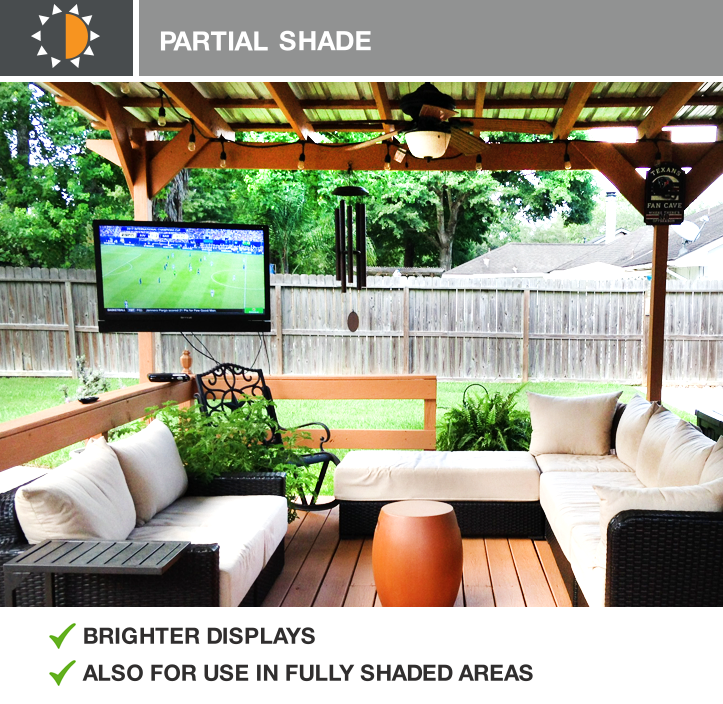 SkyVue Fusion Series Outdoor TVs are 50% brighter than indoor TVs. Indoor TVs have an average of 250 nits of brightness. Even in a shaded environment the higher brightness will give you a better picture and considerably enhance your viewing experience.